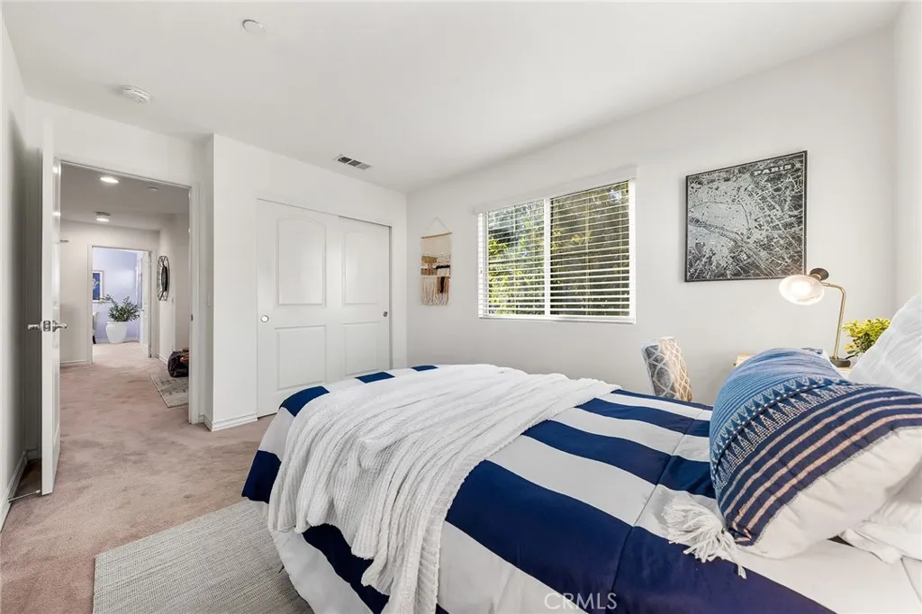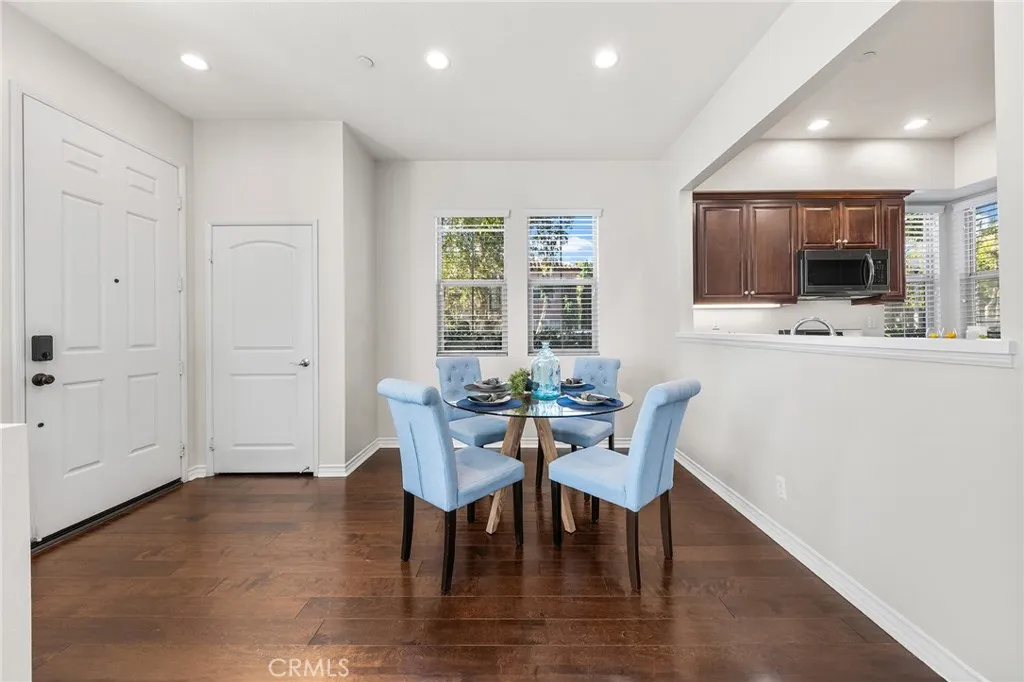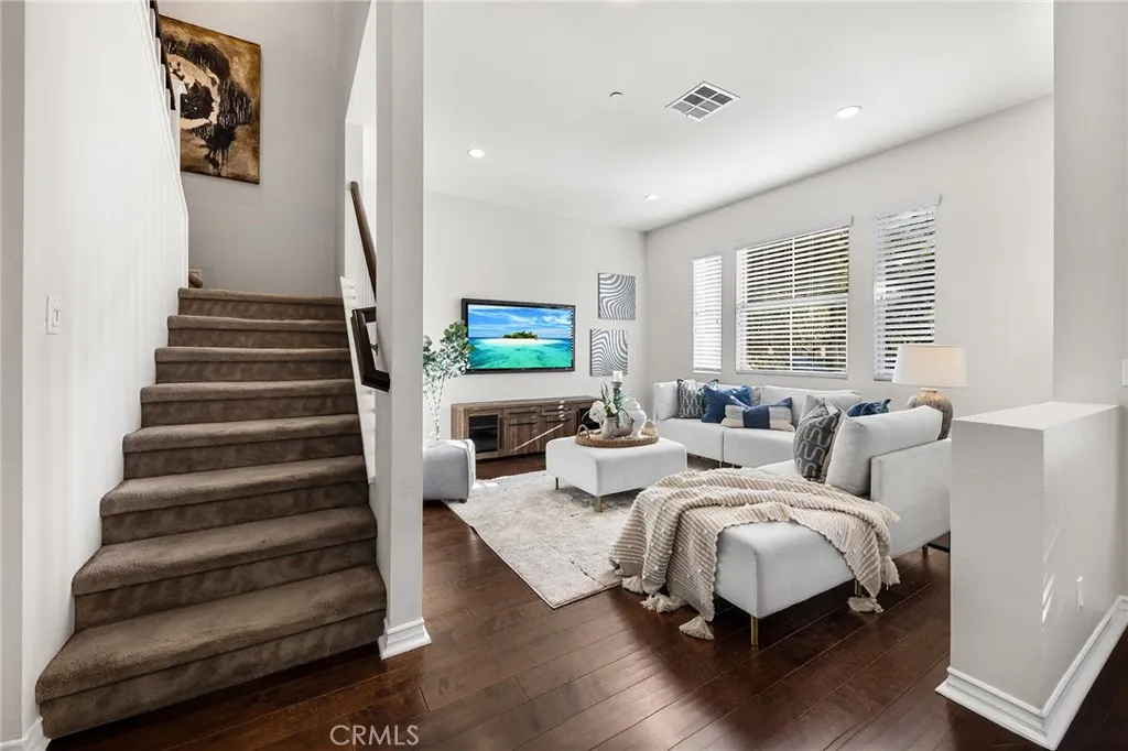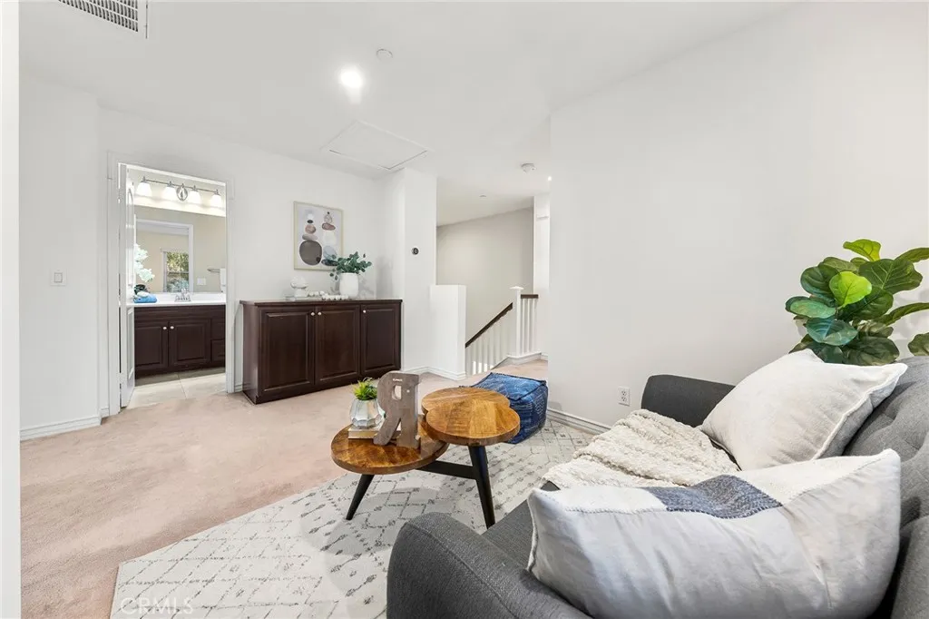 Welcome to this quiet and sun-filled south-facing corner-lot townhouse located in the highly desirable Woodbury East neighborhood. Set within a peaceful, interior location of the community and directly facing a neighborhood park with expansive green space, this home offers a serene setting along with its prime orientation and corner positioning, allowing for abundant natural light throughout the day. This residence offers an open floor plan with 3 bedrooms plus a loft, 2.5 bathrooms, and approximately 1,500 sq ft of living space. Interior upgrades include distressed-style flooring on the main level, plush carpeting upstairs, recessed lighting, custom interior paint, a smart home thermostat, and an electric vehicle charger. The gourmet kitchen is thoughtfully designed with granite countertops, rich mahogany cabinetry, and stainless steel appliances. The upper level is well organized, featuring a primary suite, two secondary bedrooms, and a versatile loft. The primary bedroom is enhanced by vaulted ceilings, creating a sense of openness while remaining exceptionally bright and spacious. The remodeled primary bathroom offers dual sinks, a well-appointed walk-in shower with elegant tile and mosaic detailing, and a generously sized walk-in closet, providing both comfort and functionality. The two secondary bedrooms are each well proportioned, offering comfortable layouts suitable for a variety of living needs. A versatile loft provides flexible functionality, ideal for a home office, reading lounge, or children's play area. A separate laundry room includes a washer and dryer. Outdoor enjoyment continues with a large front patio finished with artificial grass, perfect for relaxing or entertaining. Additional highlights include an attached two-car garage. Located within the award-winning Irvine Unified School District and just minutes from Woodbury Town Center. Residents enjoy the resort-style amenities of Woodbury East, including a 3.45-acre neighborhood park, a 2,470 sq. ft. recreation center, a junior Olympic-sized pool, wading pool, spa, fitness center, tennis and basketball courts, barbecue areas, and a vibrant tot lot - offering a true resort-inspired lifestyle. Convenient access to Irvine Spectrum, major freeways, John Wayne Airport, scenic biking and hiking trails, and the region's renowned coastal destinations completes the appeal of this exceptional location.